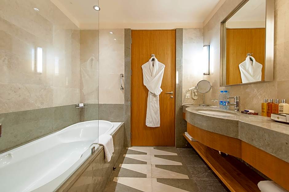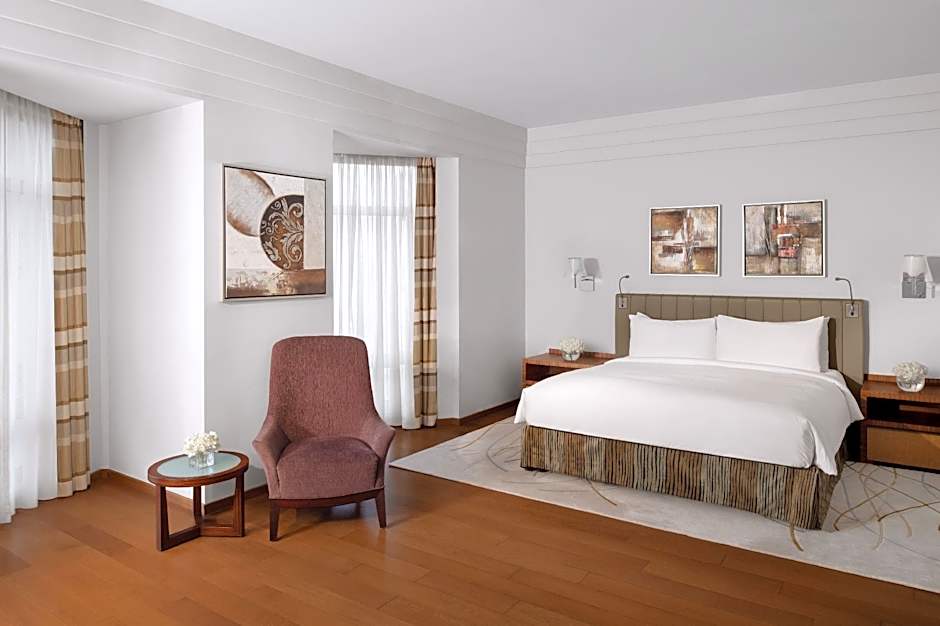 This 54-sqm room features elegant accommodations with a stylish king size bed, a separate living room and a generous bathroom that includes premium amenities and hairdryer. With a functional desk, one may access work with the advantage of direct dial phone, free Wi-Fi Internet connection and satellite LED TV. Also, a safe box and mini-bar with tea and coffee making facilities are provided, complimenting an enjoyable stay.